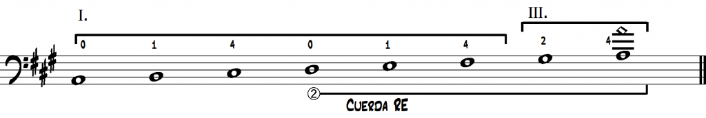 1. Toca la escala de LA mayor (una octava) usando los dedos segundo y cuarto para tocar SOL # y LA respectivamente sobre la cuerda RE en la tercera posición.